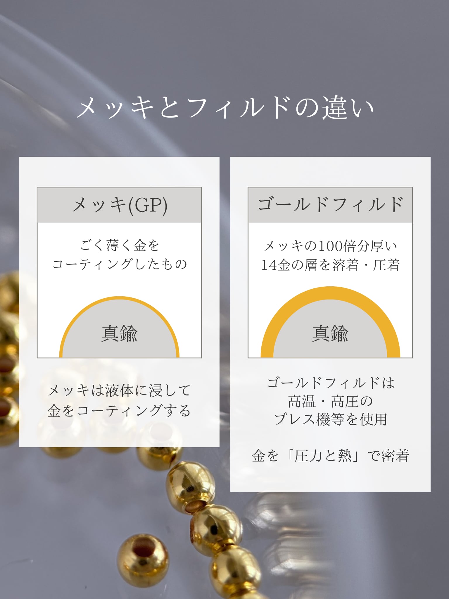 金の層はメッキの約100倍の厚みがあります。