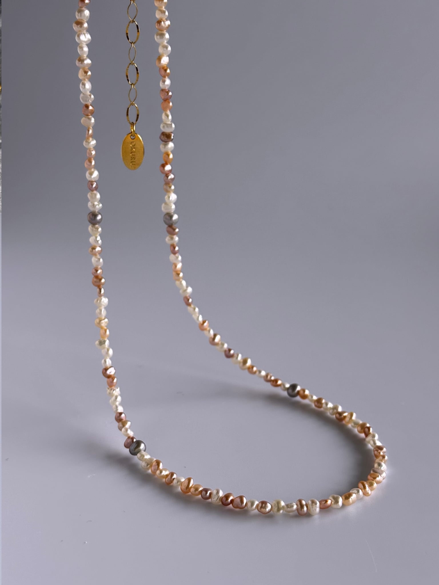 小粒ながらもしっかりとしたツヤ感があり、肌にやさしく光を映し込むことで、首元から顔まわりを自然に明るく、美しく見せてくれます。